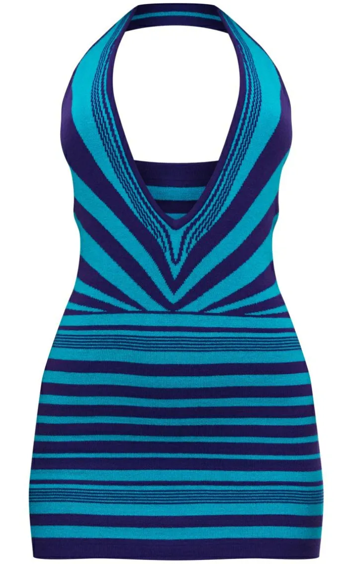 Stand out from the crowd with this turquoise two tone abstract stripe knit plunge dress. We know this piece will earn you all the right attention. Made using a knit material with a two tone turquoise hue, a stripe print and a plunging neckline for some extra attitude, what more could you ask for? This daring piece is sure to earn you all the likes. Wear with knee high boots and simple accessories for a look that will make heads turn.
