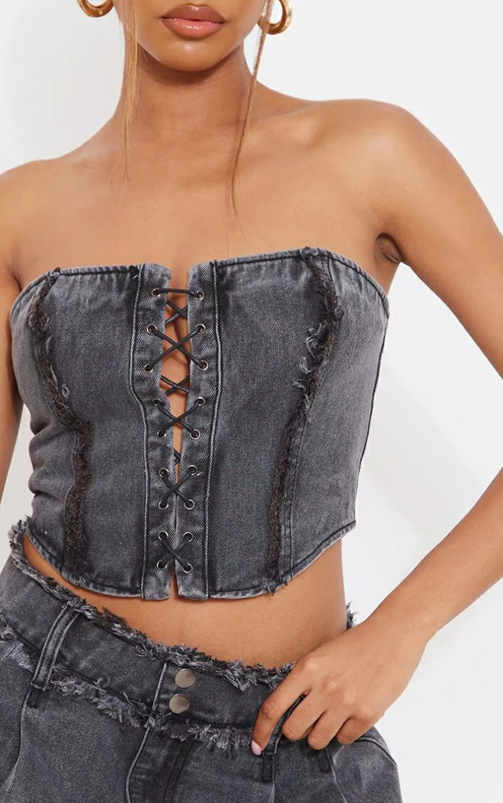 Get your new season ‘fit on point with this washed black distressed edge lace front denim corset top. Brought to you in a washed black denim material with a distressed edge design, lace front detailing and a flattering corset fit, you really can’t go wrong. We are loving this corset top styled with the matching skirt, heeled boots and gold accessories for a look that will have heads turning your way.