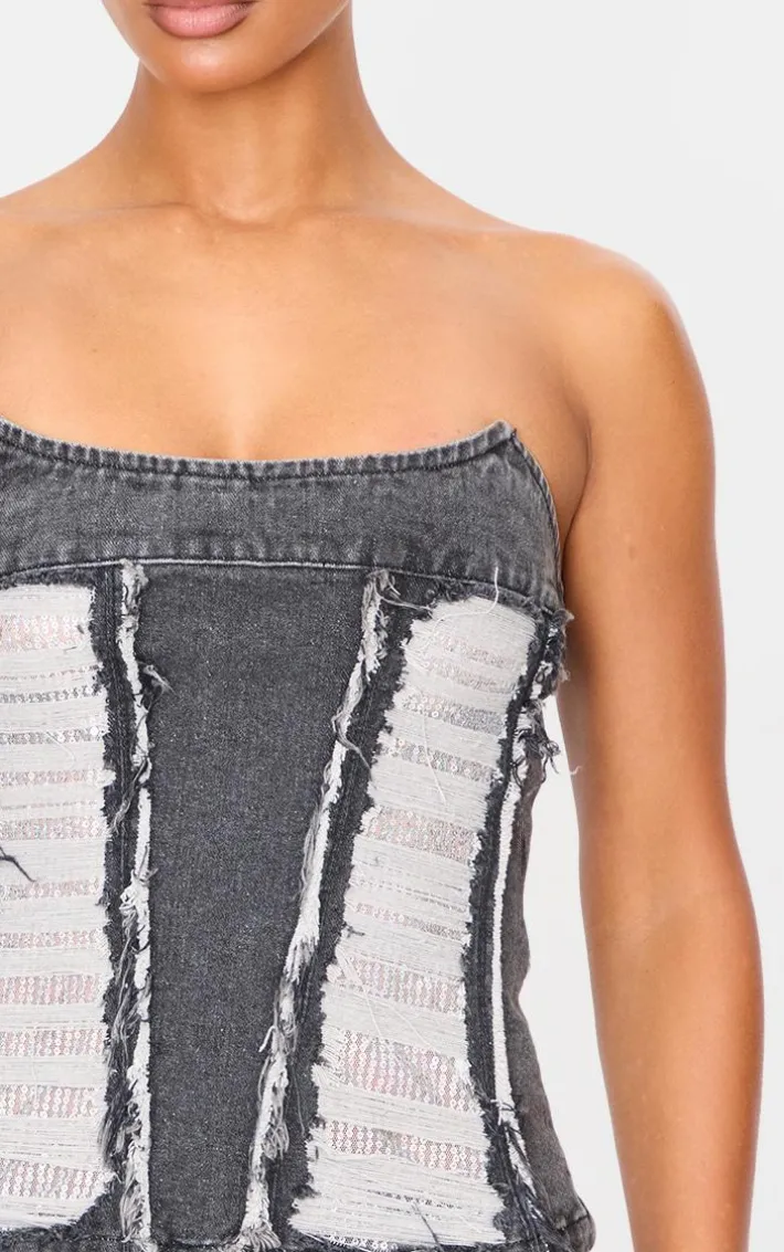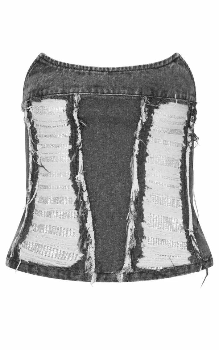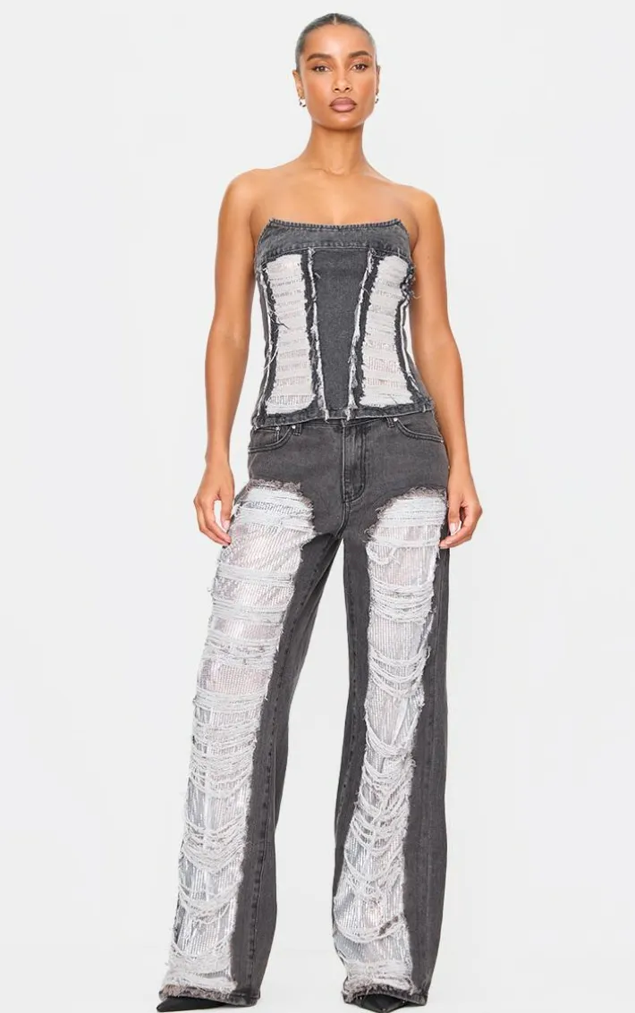 This washed black extreme distressed sequin panel strapless denim top is a must have whatever your weekend plans. Brought to you in an edgy washed black hue, with an extreme distressed design, a sequin panel detail and denim material, reach for this for a look you won’t regret. Pair with the matching jeans and black court heels. It’s a yes from us.