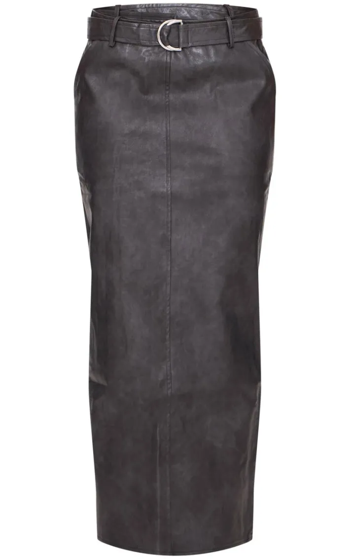 Take your weekend wardrobe to new heights with this washed black faux leather belted maxi skirt, you’re sure to be earning all the style points. Made using a washed black faux leather material with a belt detail and a figure-flattering fit, this maxi skirt will be your new go to. Pair this maxi skirt with a black tee, pointed toe heels and statement accessories to have all eyes on you.