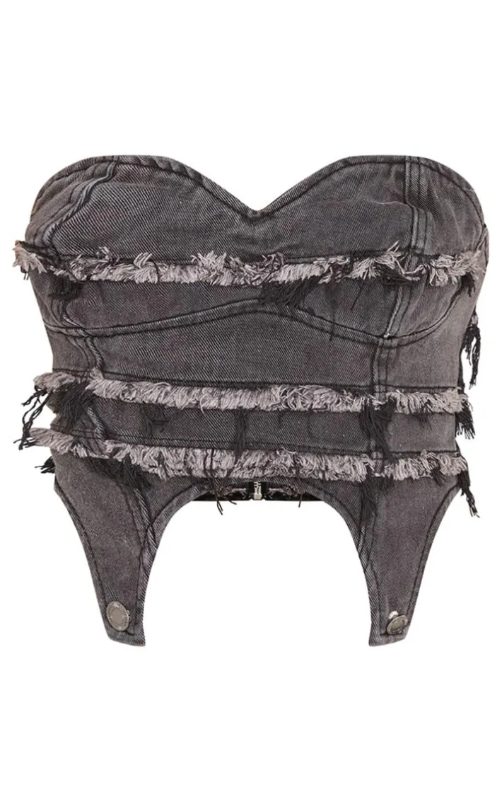 Make a statement this season with this washed black frayed seam detail denim corset. Made from a washed black material with a frayed seam detail, perfect for bringing all the edge to your weekend looks. This unreal corset pairs perfectly with the matching mini skirt and some clear heels for a look everyone will be talking about.