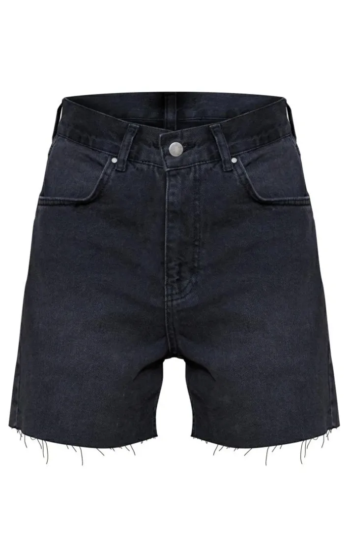 Give your wardrobe the update it needs with these washed black raw hem longline denim mom shorts. Made from a washed black material with a raw hem and a longline style. These mom shorts are perfect for taking any look from 0-100 instantly. Shop the look and add a black denim cropped jacket, cap and box-fresh kicks for a blogger-worthy combo.