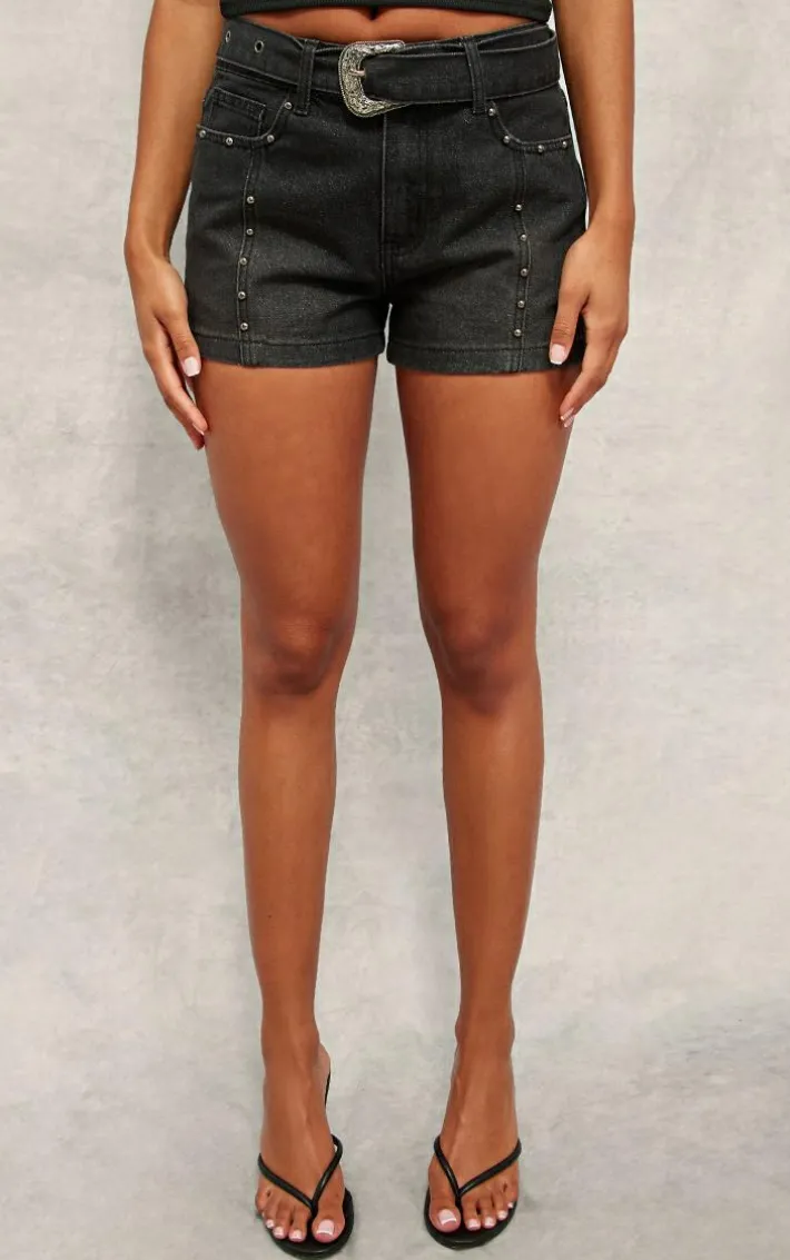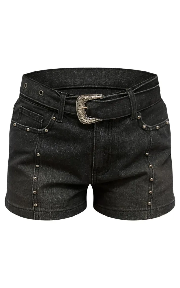 Elevate any look instantly with these washed black western belt studded denim mini shorts. Brought to you in a washed black material with a western belt and a studded detail adding a touch of luxe like no other. These mini shorts are perfect for those nights. Team with a basic tee and your fave slip-on heels for a look that is sure to turn heads.