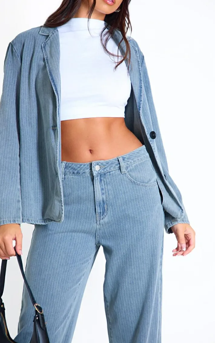 Set major trends with these washed blue pinstripe lightweight denim boyfriend straight leg jeans. Brought to you in a washed blue denim material with a pinstripe design what more could you want? These lightweight boyfriend jeans have a straight leg fit we just can’t get enough of. Team with a denim jacket and some court heels for a chic look we are obsessing over.