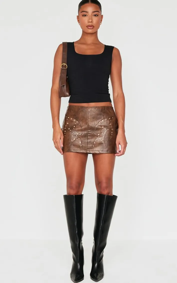 When the weekend calls, so does this washed brown faux leather studded mini skirt. Brought to you in a washed brown faux leather material with a studded detailing adding all the edge to your outfit. With a mini length, all eyes will be on you for all the right reasons. Team with a crop top, some statement boots and your fave accessories to elevate the look instantly.
