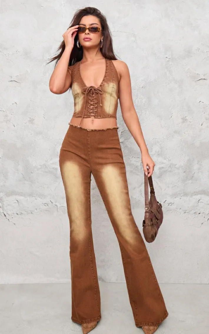 Bring all the edge with these washed brown lace up denim jeans. Brought to you in a washed brown denim material with a lace up design, what more could you want? These jeans are sure to have you setting major trends. Team with the matching top and a pair of shades to finish off the look we are loving.