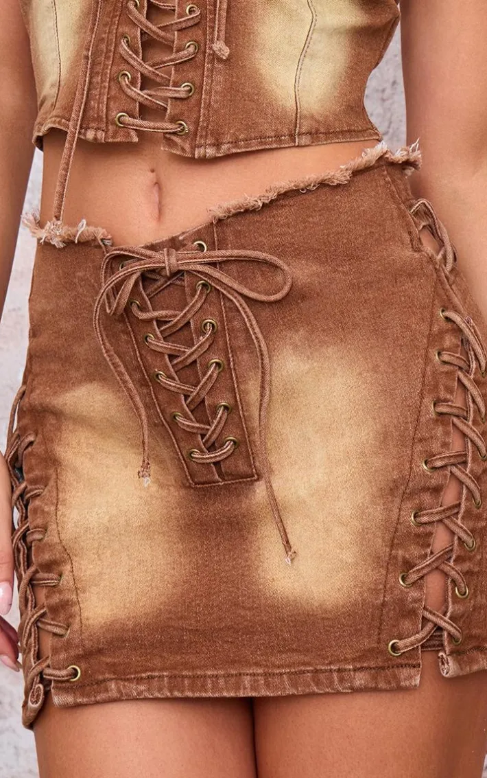 This washed brown lace up denim mini skirt is a must have this season. Brought to you in a washed brown denim material with a lace up design, giving you a flattering fit like no other. Team this mini skirt with the matching crop top, a pair of heels and a statement coat to feel effortlessly chic.