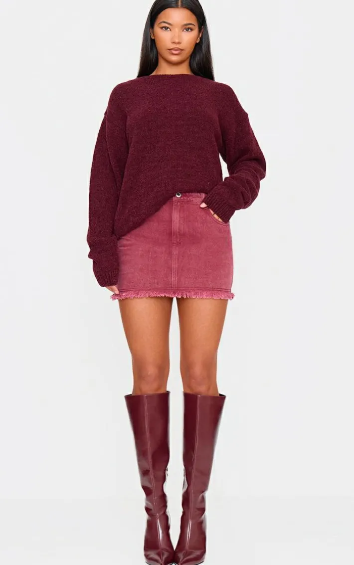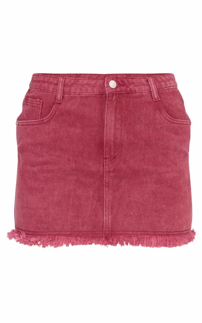 Set major trends with this washed burgundy raw hem denim mini skirt. Brought to you in a washed burgundy denim material with a raw hem detail adding all the edge to your outfit of the day. Team this unreal mini skirt with a sweater and knee length boots for a look that will turn heads for all the right reasons.