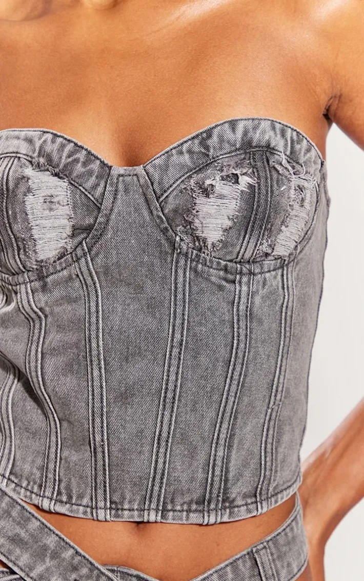 Your weekend fit is finally sorted with this washed grey distressed cup denim corset top, you won’t be able to resist this statement piece. Made using a washed grey denim material with a distressed cup design and a corset style that is perfect for showing off your unreal shape. Style this denim top with the matching skirt, slip-on heels and a shoulder bag for a look that is perfect for your next event.