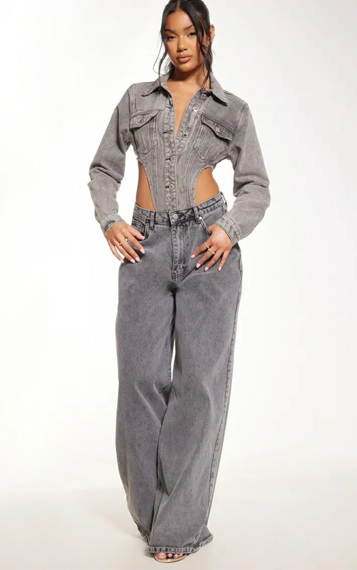 Switch up your weekend style game with this washed grey pocket front denim jacket high side bodysuit. Brought to you in a washed grey hue denim material with a high side design, long sleeves and pocket front detailing, how can you say no? We are loving this denim bodysuit styled with matching hue jeans, your highest heels and gold accessories for a fierce weekend-worthy ‘fit that is sure to earn you some serious style points.