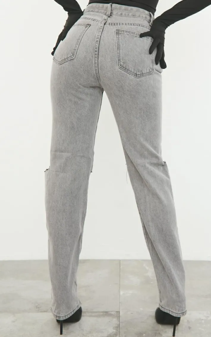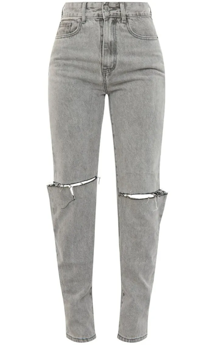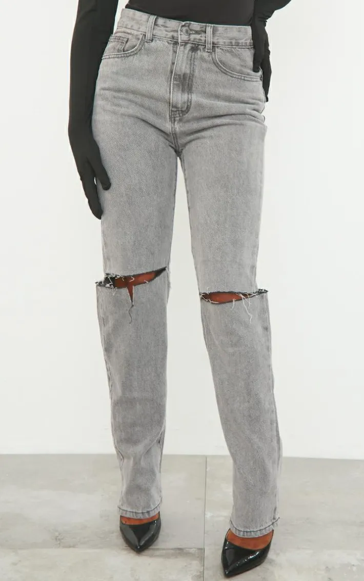 Dress these jeans up or down for this weekend. Featuring a washed grey denim material with a slash knee and straight leg leg fit, style these with a leather corset and heels for a look we’re loving.