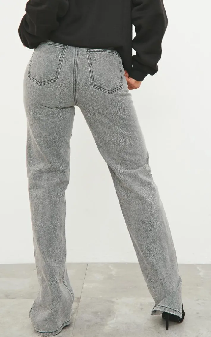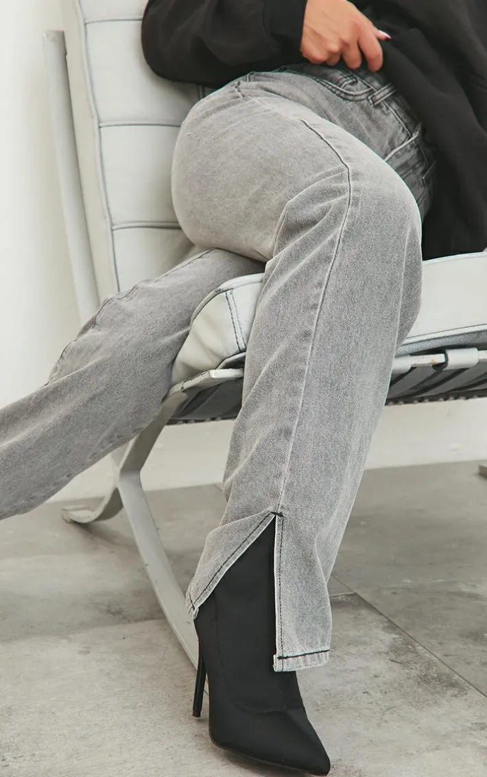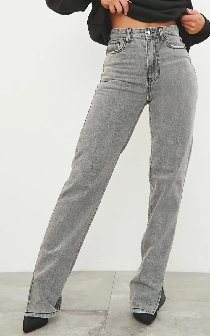Give your denim an update with these jeans doll. Featuring a washed grey denim, a split hem, and a straight leg fit. Team these with a black sweatshirt and heeled boots for a look that is sure to have heads turning.