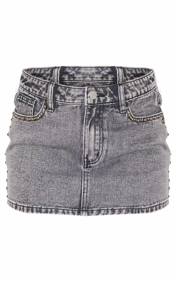 Elevate your double denim look with this washed grey studded denim micro mini skirt. Brought to you in a washed grey denim material with a studded detailing and a micro mini length, how can you resist? Style this mini skirt with the matching jacket, heels and accessories for a look that will steal all the stares.