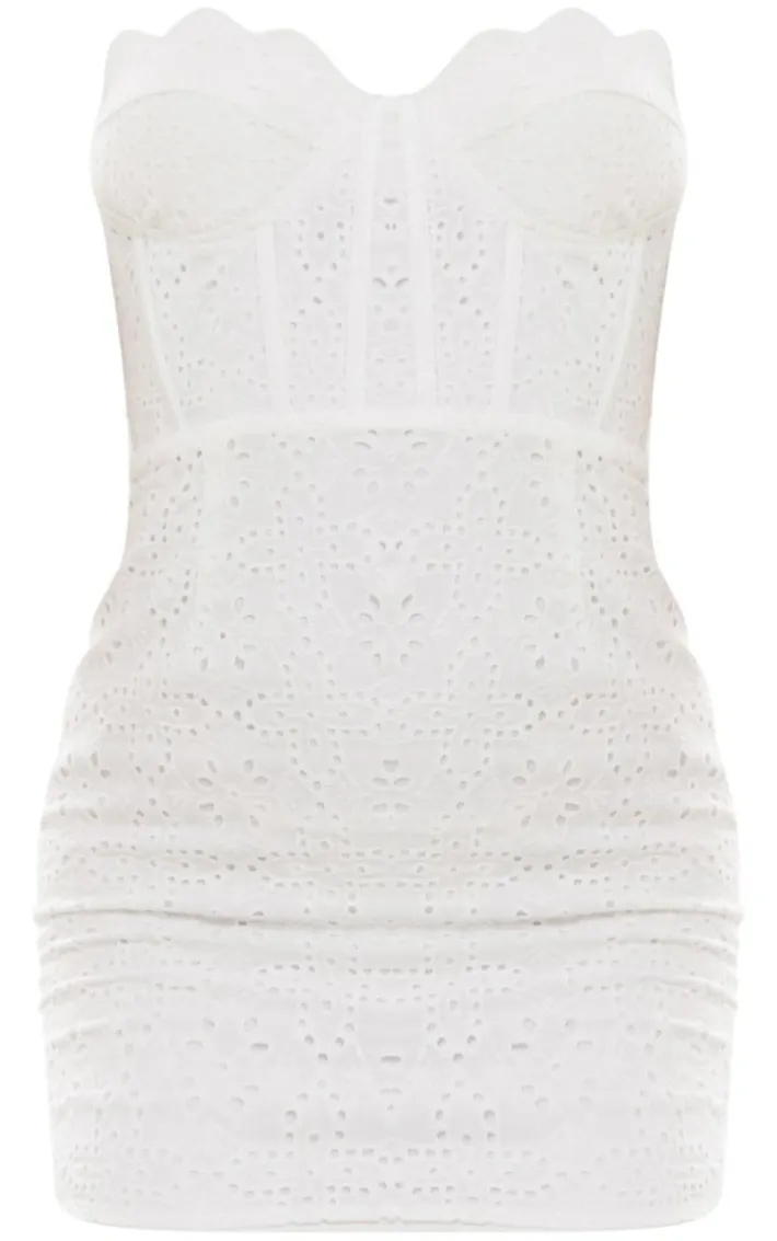Channel all the glam vibes this weekend with this white broderie anglaise bandeau scallop bodycon dress. Its white broderie anglaise material is so on trend this season and its bandeau neckline with scallop edging gives you a luxe touch. This bodycon dress hugs your figure in all the right places and you are sure to turn heads in this dress. Style with clear heels, gold accessories and a mini bag for a vibe that won’t go unnoticed.