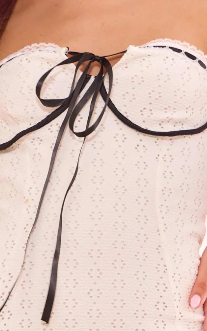 Add some seriously chic vibes into your new season wardrobe with this white broderie contrast ribbon bandeau bodycon dress. It is made using a white material with contrasting ribbon detailing and a bandeau style, what more could you want? Style with your go to accessories for a look everyone will be crushing on.