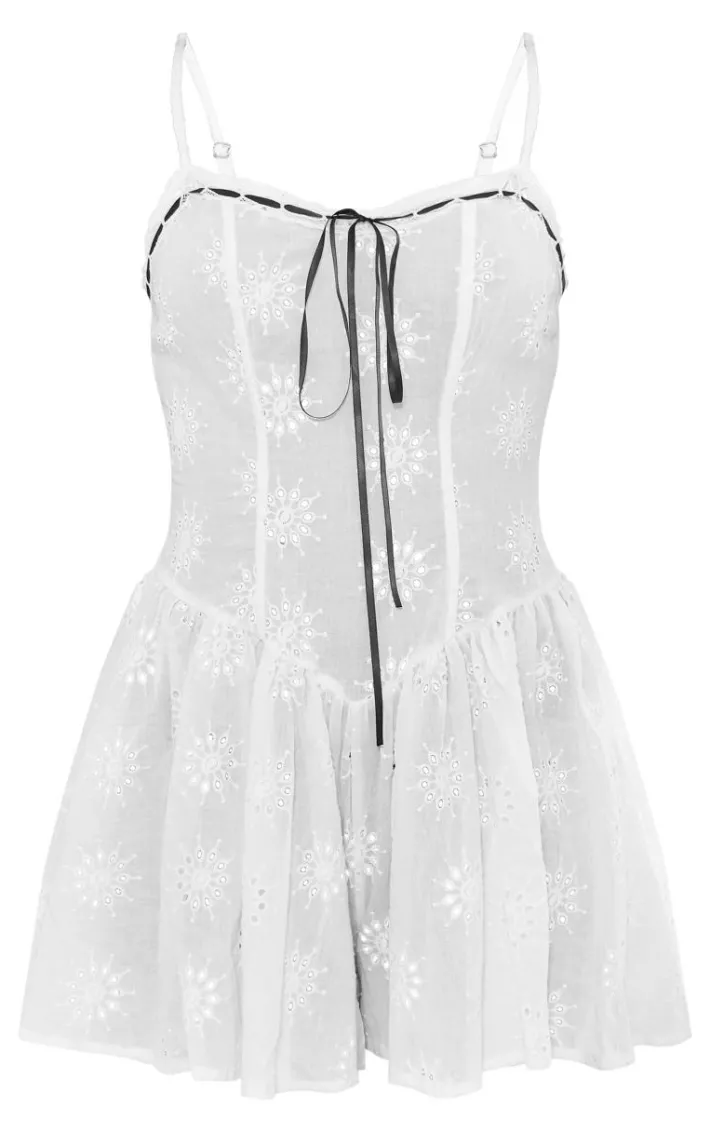 Take your new season wardrobe to the next level with this white broderie ribbon detail strappy shift romper. Brought to you in a white broderie material with ribbon detailing and a shift style, this romper is the perfect versatile piece to take you from AM to PM with ease. Style this broderie romper with sandals and simple accessories for a luxe finish.