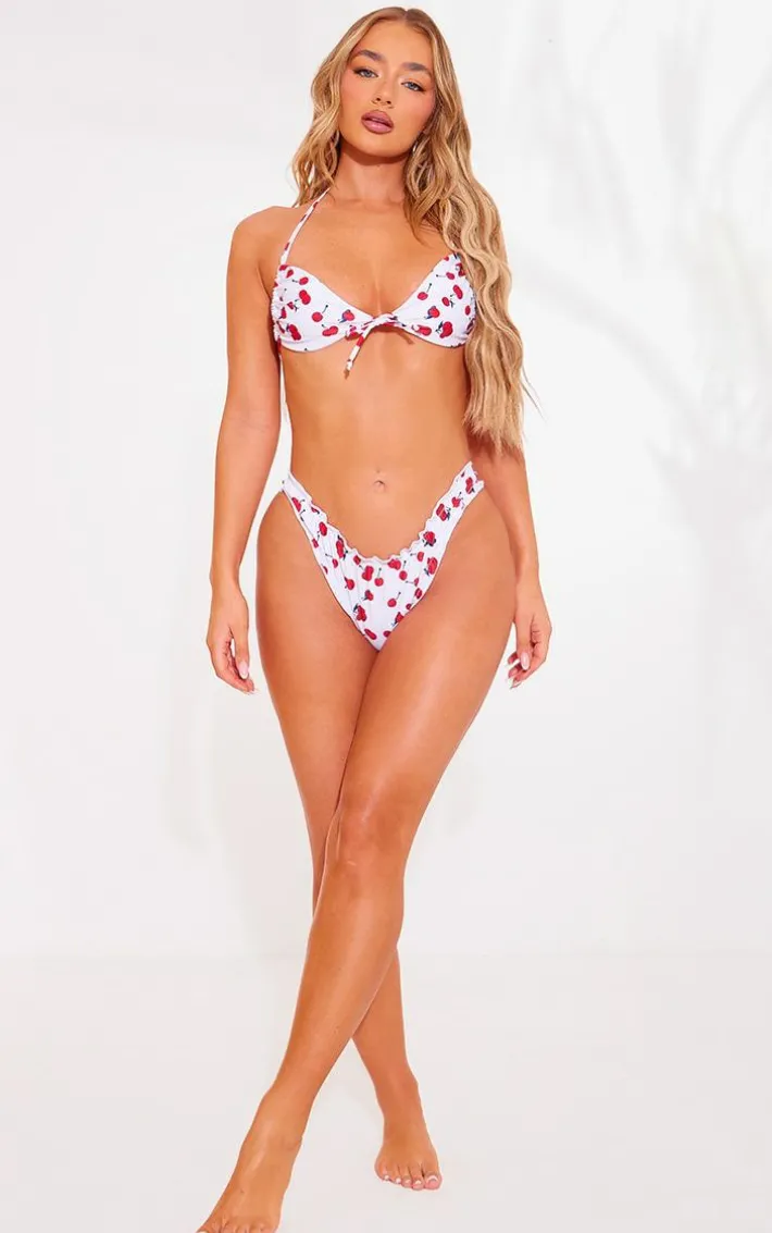 Inject some fruity print into your vacay wardrobe with this white cherry print ruched high leg bikini bottoms. Brought to you in a white cherry print material with ruched detailing and a high leg design, these are a must-have. Style these bikini bottoms with the matching bikini top and gold accessories for a sun-kissed look.