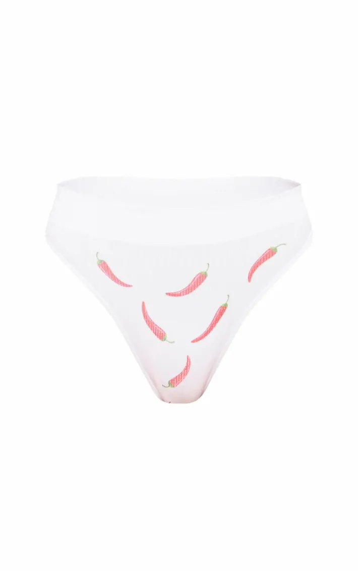 Opt for this white chilli print ribbed thong for a look that you’ll be reaching for daily. Brought to you in a white shade, with a chilli print design and ribbed material, how can you say no? Style with the matching bralette for a cosy feel we’re loving.