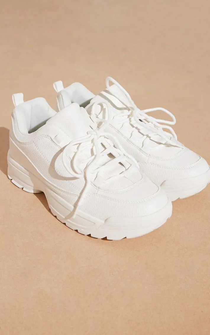 Chunky footwear is now essential for any shoe-drobe and we are obsessing over these sneakers. Featuring a white faux leather material with a chunky cleated sole an a lace-up front, we are obsessed.