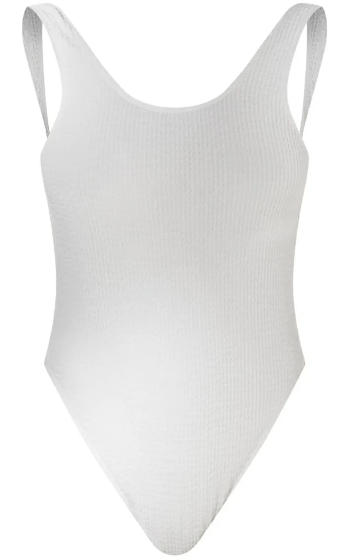 You are sure to steal the show with this white crinkle low scoop back swimsuit. Made using a white hue crinkle material with a low back and a figure-flattering fit that will earn you all the likes, what’s not to love? We know it won’t disappoint. Wear with gold gue accessories, sandals and a tote bag for a day by the pool.