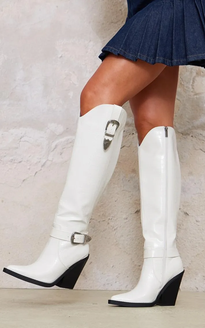 Level up any look with these white croc PU point toe high block heel knee high western boots. Brought to you in a white croc PU material with a point toe design and a block heel detail, we are obsessed. These knee high wester boots are sure to make a statement. Team with your go-to outfit to feel chic this season.