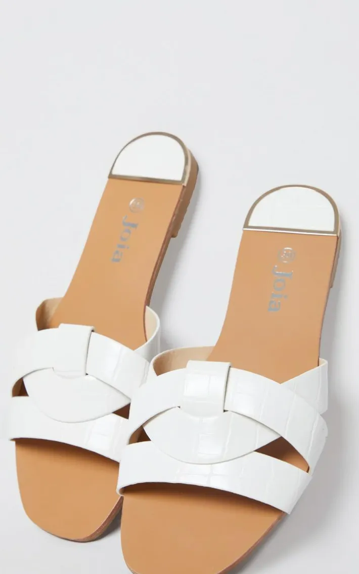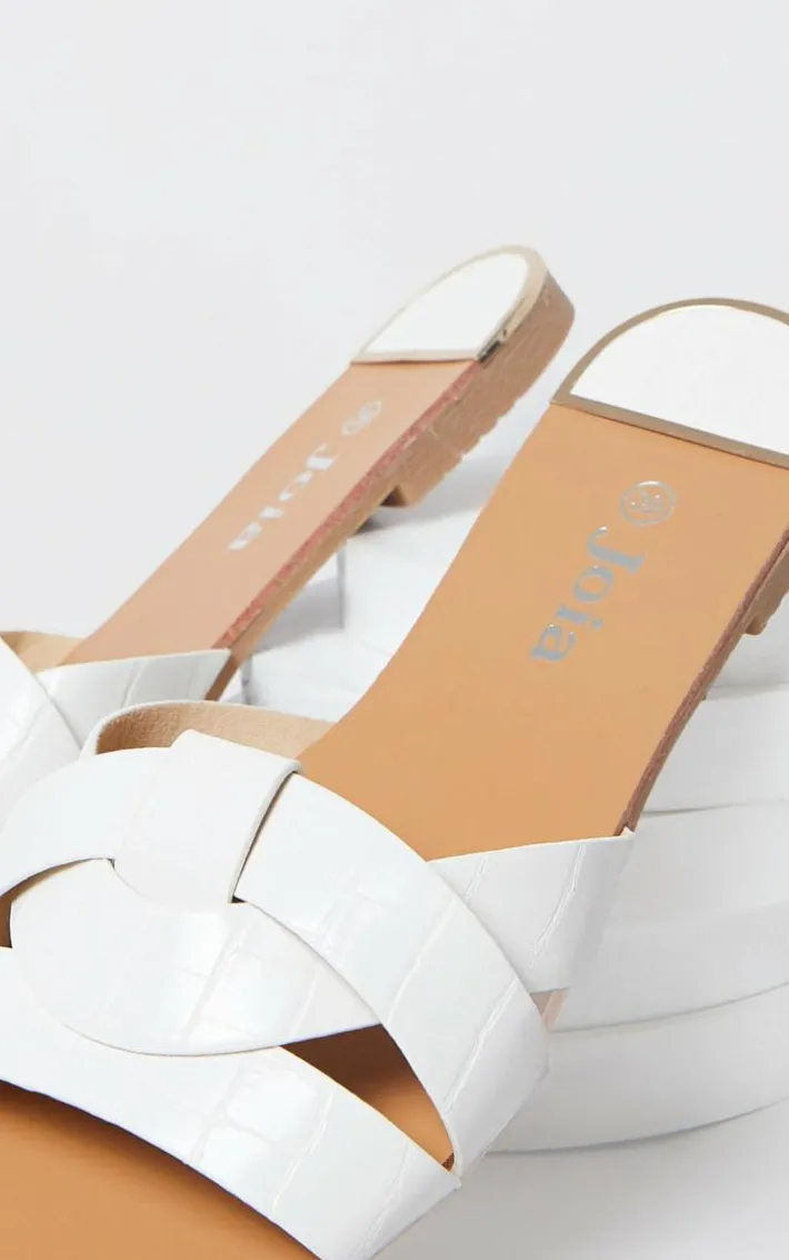 This cross over strap sandals are perfect for adding to your off-duty look. Featuring a flat tan sole and a white croc effect faux leather strap, we are obsessed.