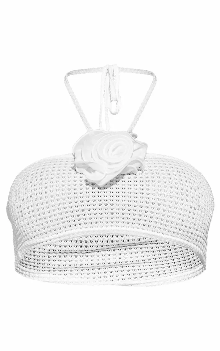 Get your glow on this season with this white crochet flower applique beach top. Brought to you in a white hue crochet material with a flower applique detail, this beach top is unreal. Style with the matching maxi skirt and gold accessories for a glam finish. It’s a yes from us.