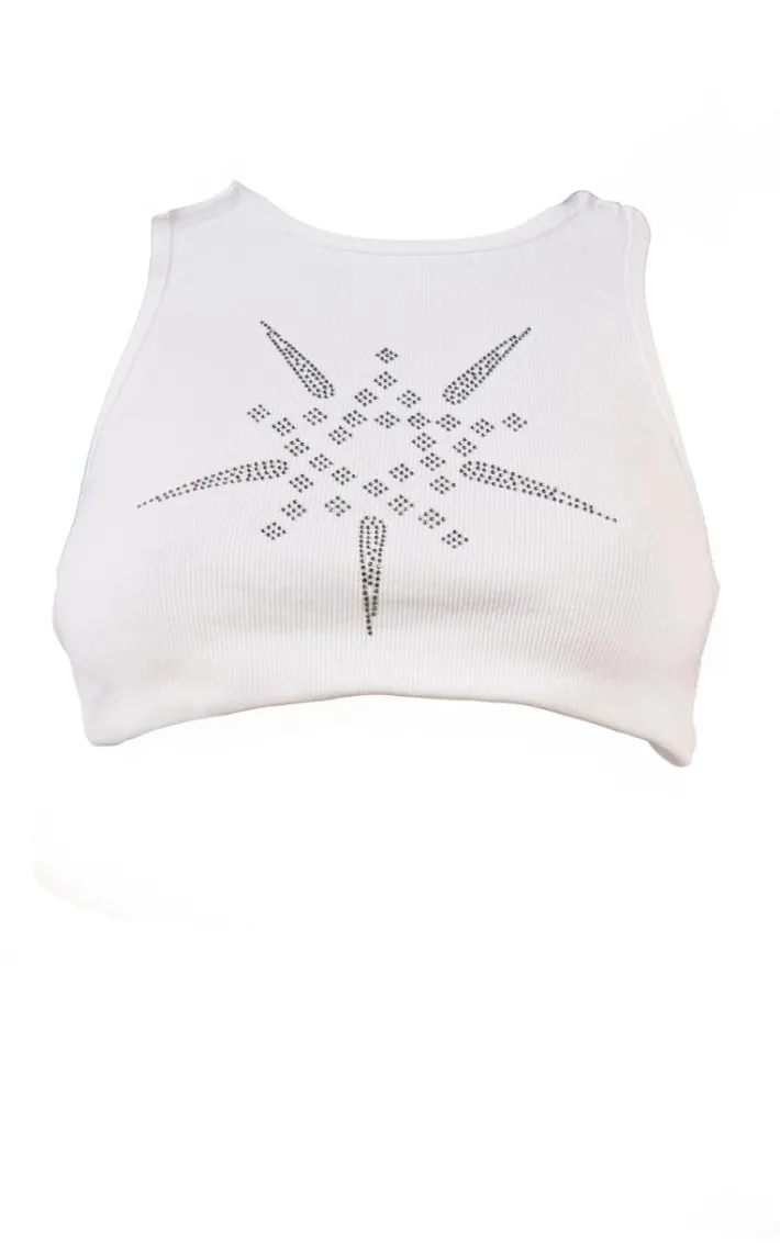 Your wardrobe is calling out for this white diamante graphic ribbed racer neck crop top for your new season look. Brought to you in a white material with a diamante graphic design, how could you resist? Its ribbed detail and racer neck fit will have you feeling effortlessly chic. Team with a mini skirt, heeled boots and gold accessories for a weekend-worthy finish.