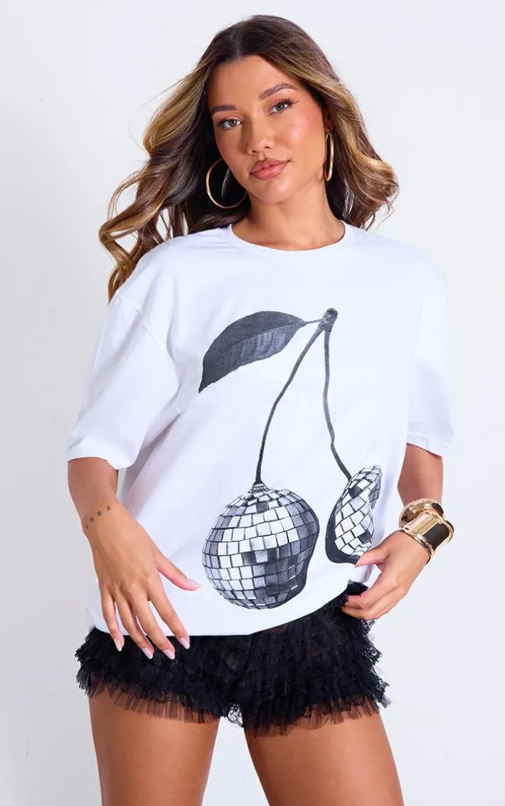 Bring the party in this white disco cherry graphic oversized T shirt. Brought to you in a white hue material with a disco cherry graphic detail and oversized fit, this T shirt is at the top of our wish list. Style with bloomer shorts, chunky boots and gold accessories for a look like no other. It’s official, we’re obsessed.