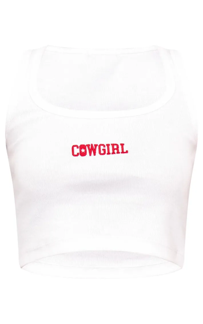 Who doesn’t love a top with a graphic? We’re here to tick all your boxes with this white embroidered rib crop top. It’s made with a white rib fabric, ‘Cowgirl’ embroidered across the chest, and a crop top fit. You’ll be ready for any occasion with matching hue shorts, a faux leather jacket and your go-to sunnies.