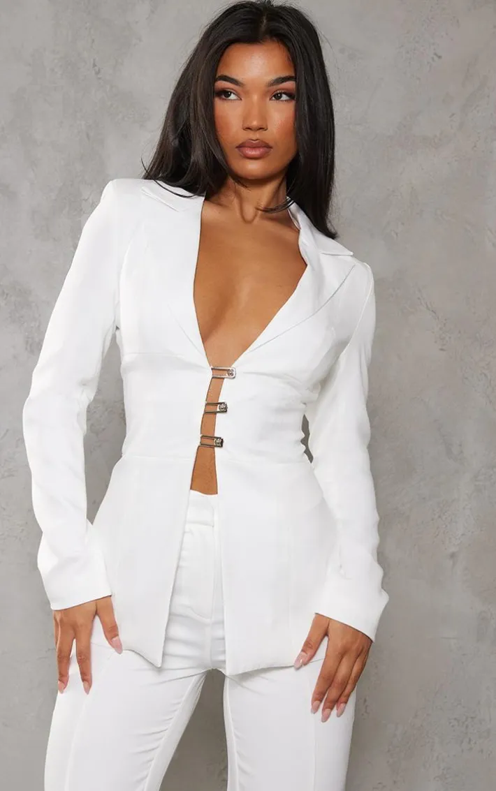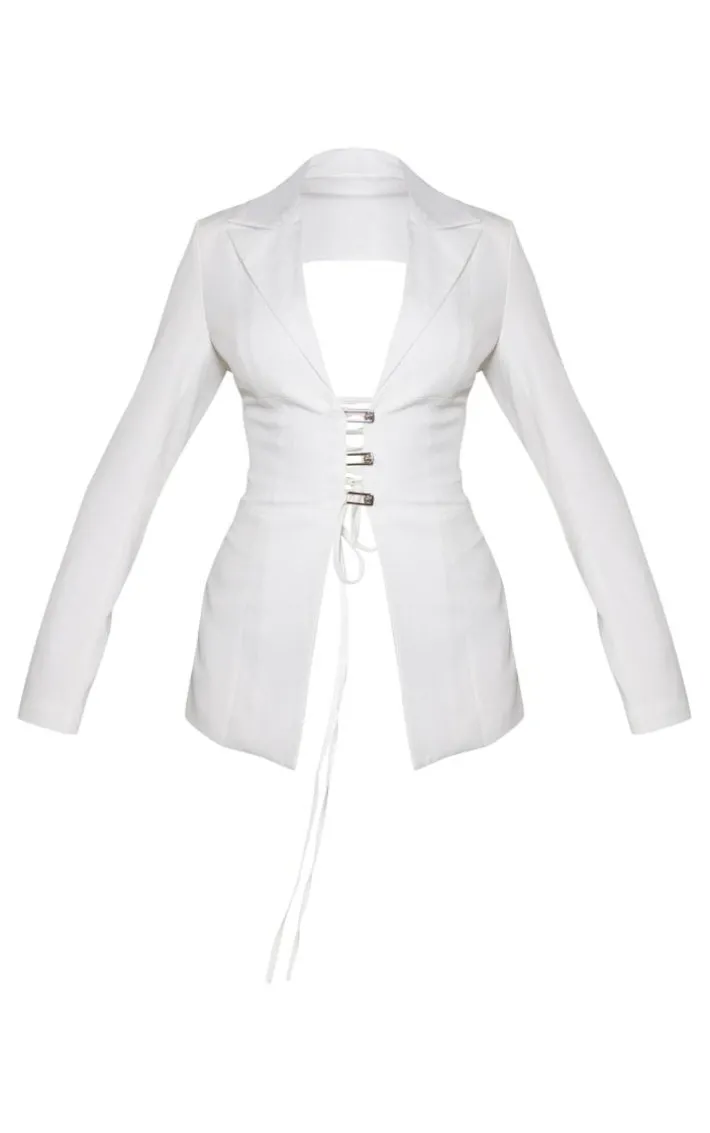 Set trends with this dreamy blazer. Featuring a white material with a lace-up back, it’s perfect. Wear with the matching bottoms, high heels and accessories to complete this weekend worthy look.