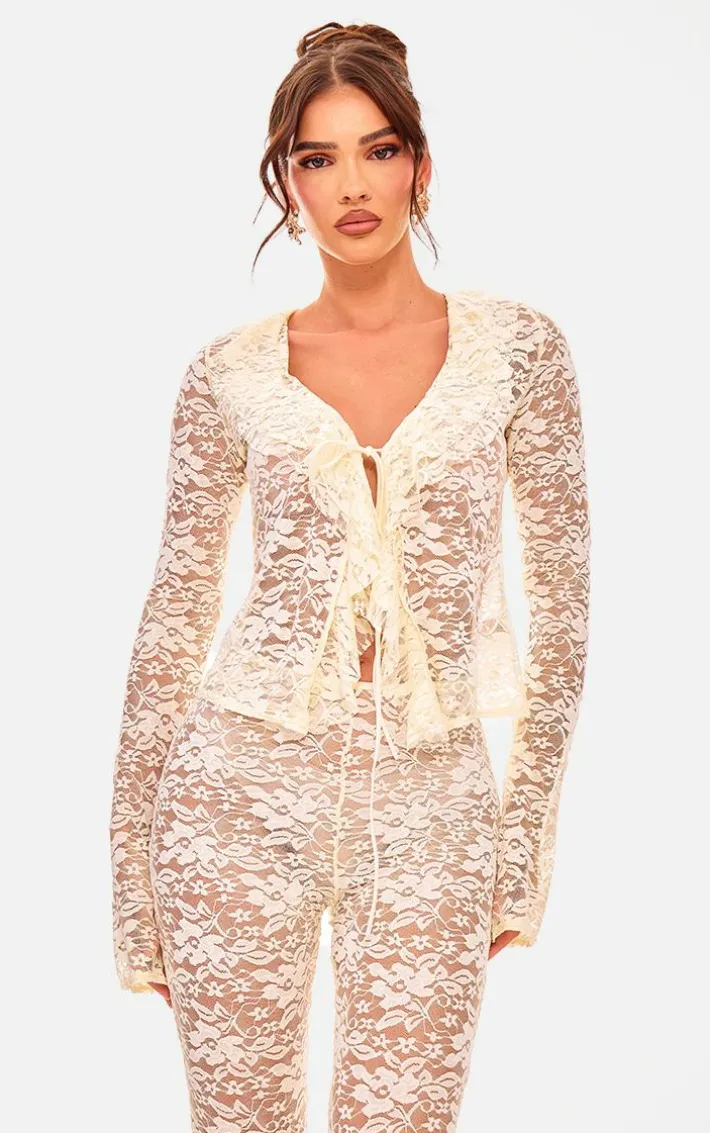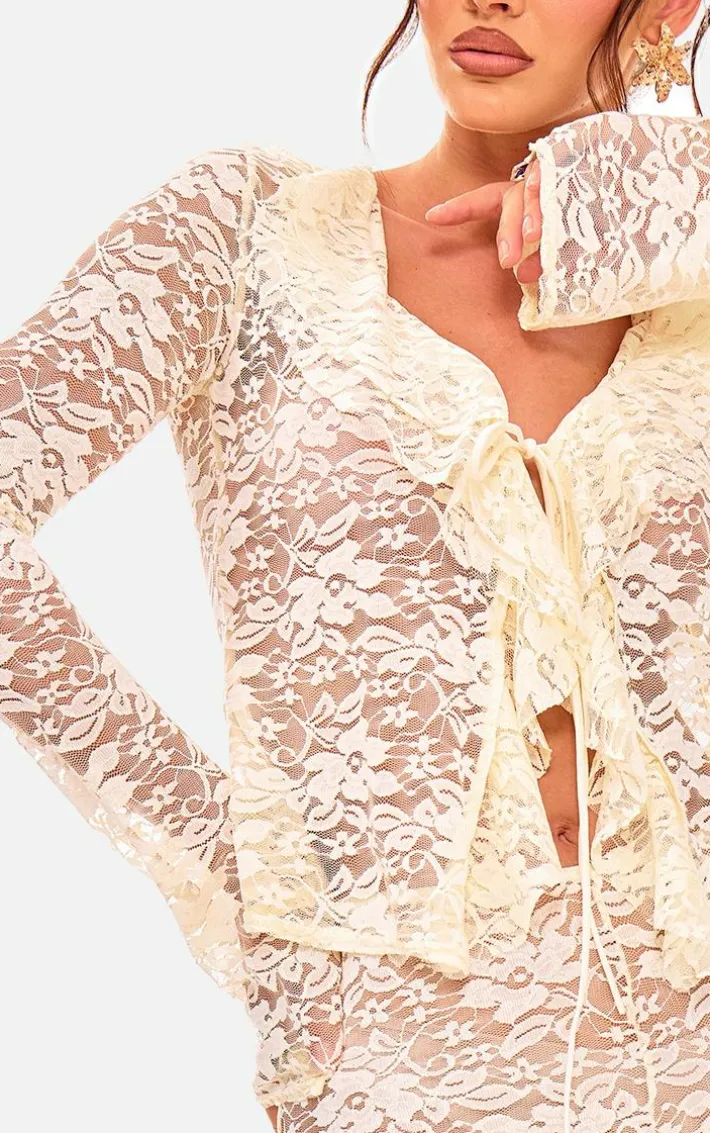 We can’t get enough of this white floral lace ruffle tie front shirt. Brought to you in a white hue floral lace material with a ruffle design and tie front fastening, this top is everything you need and more. Style with the matching pants, your fave heels ands gold accessories to earn you all the compliments this event season.