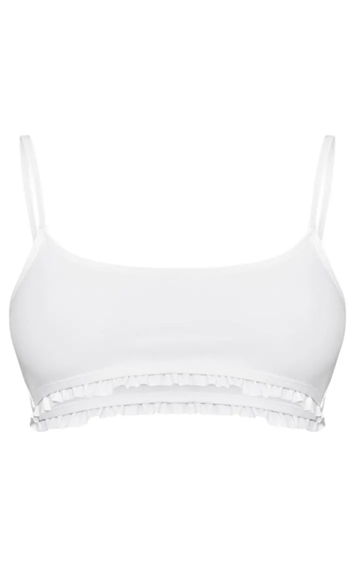 Take your poolside look to a whole new level with this white frill edge tie strap bikini top. Brought to you in a white hue material with a tie strap design and frill edge detailing, how can you not fall in love? Pair this white bikini top with the matching bikini bottoms and gold accessories for a look that is sure to have you soaking up the sun in style.