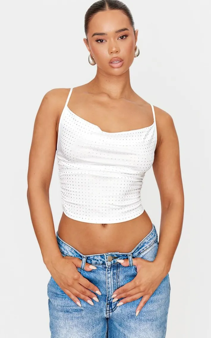 Take on your weekend in style with this white hot fix cowl neck cami top. With its must have white shade, hot fix design and cowl neck fit, we know you’ll look and feel your most confident self. Style with a pair of wide leg jeans and court heels for a look that won’t go unnoticed.