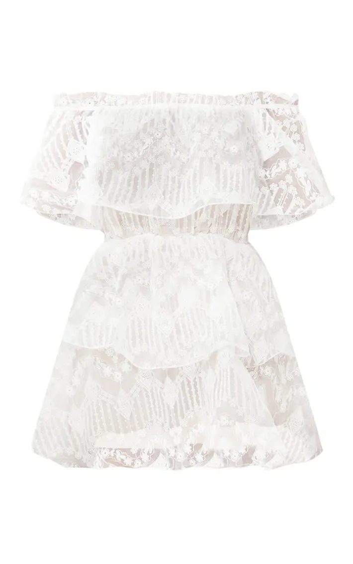 Get ready for your next big occasion with this tiered white lace dress. Featuring a white lace material with a bardot neckline and a ruffle tiered design, team this dress with strappy heels and complete the look with a matching clutch.