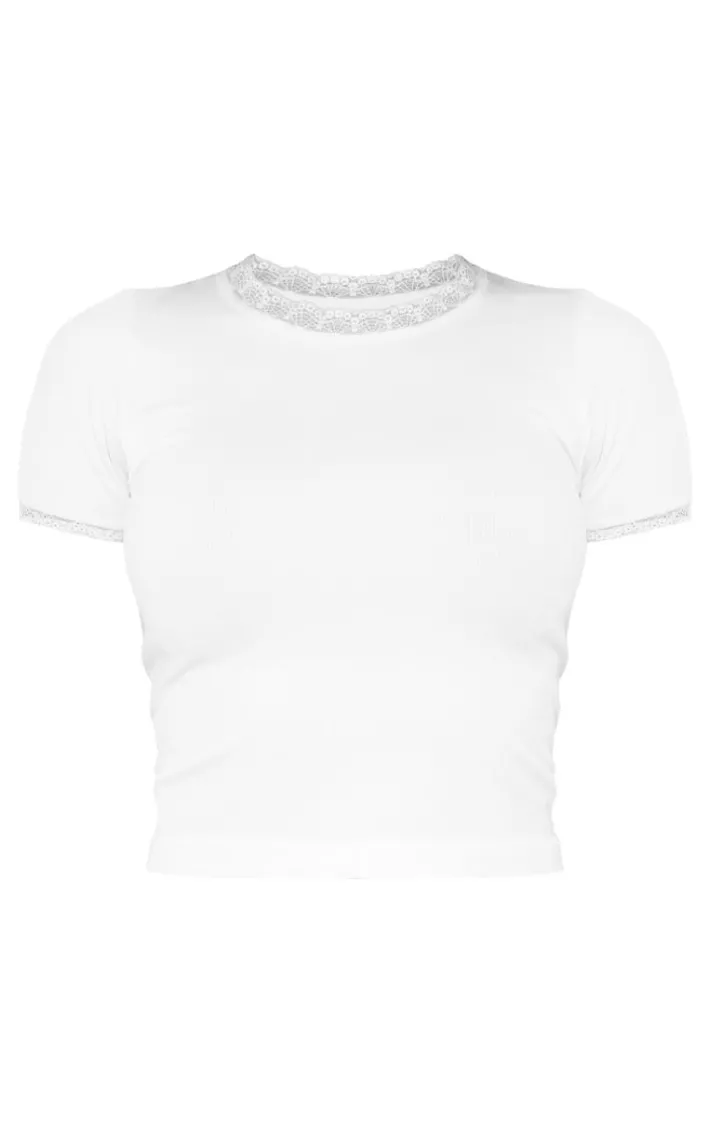 Say hello to your new basic with this white lace trim light seamless t-shirt. Brought to you in a white seamless material with a lace trim design. It’s official, we’re obsessed. Style this t-shirt with grey bottoms, sneakers, white mini bag and sunnies for that effortless office chic.