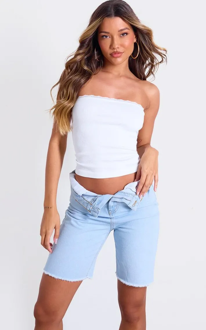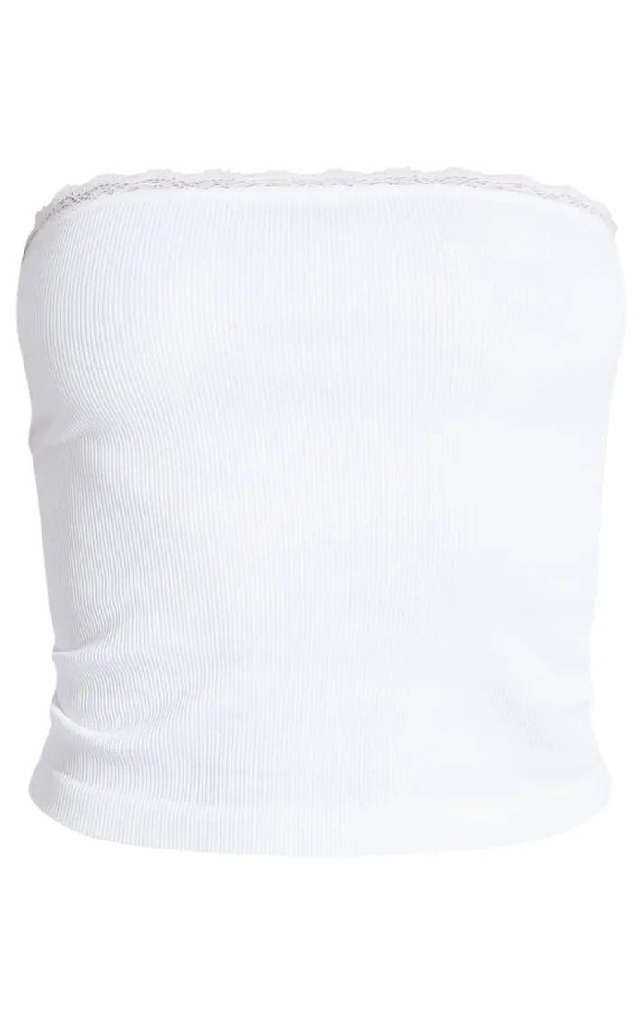 Stay in style this season in this white lace trim snatched rib bandeau top. Brought to you in a white hue snatched rib material with a lace trim detail and bandeau neckline, this top is a must have. How can you resist? Style with denim shorts, mesh ballet flats and gold accessories for a combo we’re crushing on.