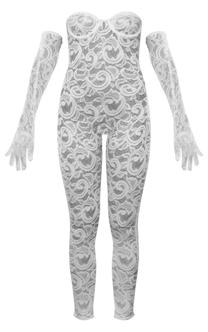 Take your look to a whole new level with this must-have piece. Featurign a white lace material and an underwired detail with stockings and gloves, how could you resist? Wear with high heels and your fave accessories for some spooky season loving.