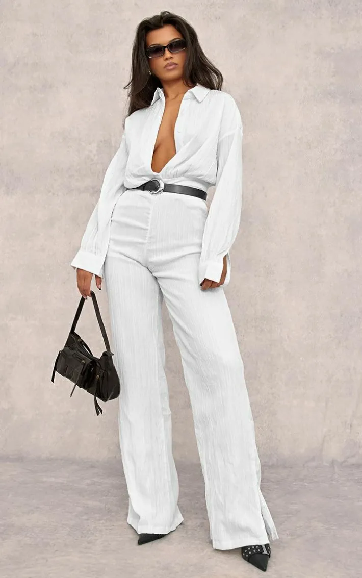 This jumpsuit is the answer to all your styling dilemmas this season. Featuring a white linen look material with a draped design and button detailing, we’re obsessed. Just add clear strap heels and a gold chunky belt for a look that will have all eyes on you.