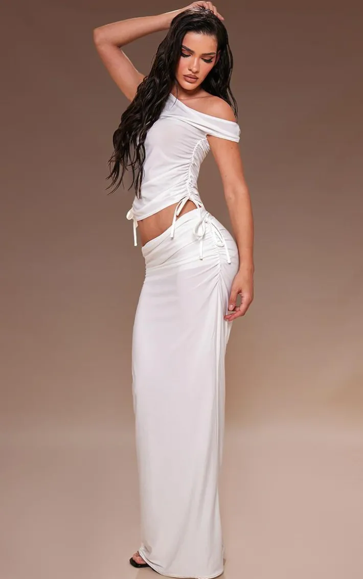 When the weekend calls so does this white matte touch one shoulder ruched tie top. Brought to you in a white matte touch material with a one shoulder design and ruched tie detail, this top is unreal. Style with the matching maxi skirt, heels and gold accessories for a chic finish.