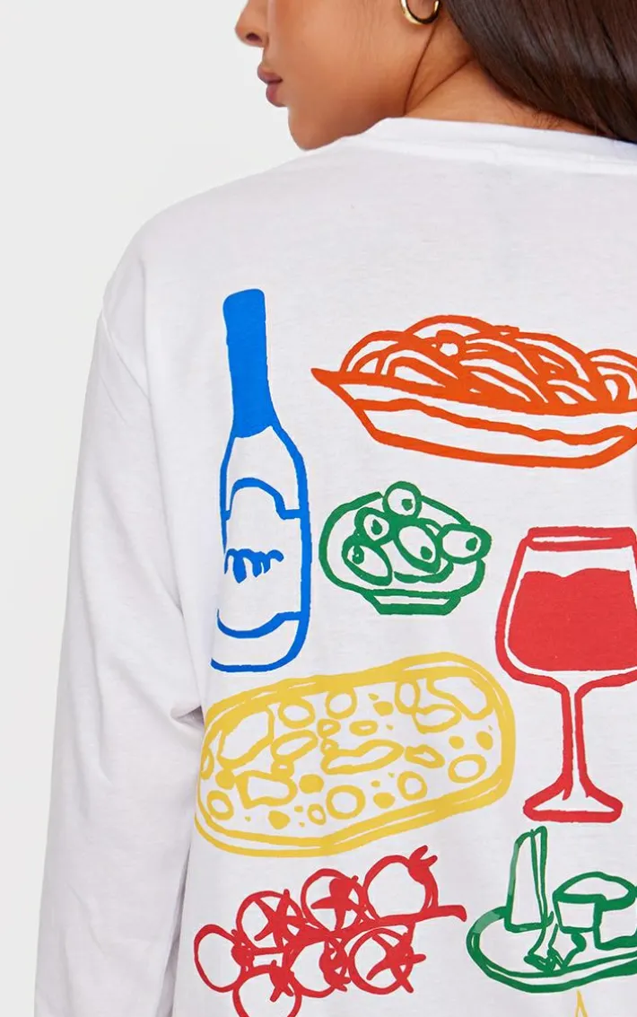 Keep it chilled with this white multi food and wine Graphic oversized long sleeve t shirt. It’s made for those throw on and go moments with its white hue fabric, food and wine print Graphic and oversized fit. Just add a mini skirt, sneakers and a faux leather handbag for an off-duty look that will never miss.