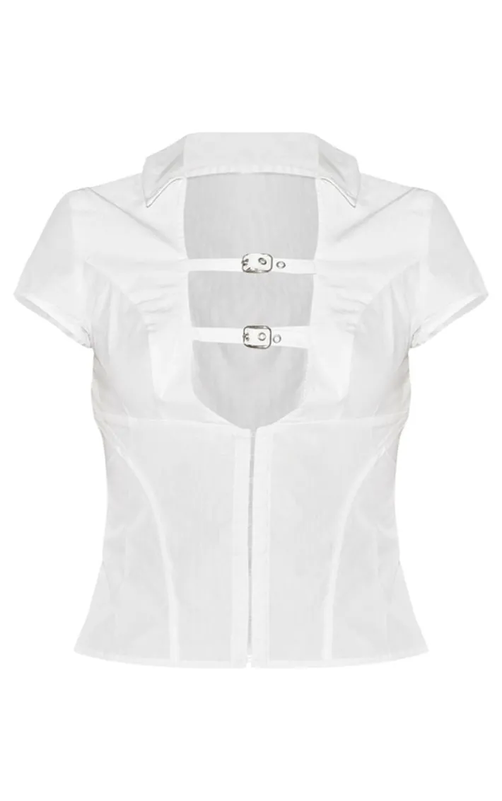 Turn heads in this white plunge buckle detail corset shirt. Brought to you in a white material with a plunge design and a buckle detail, you are sure to feel effortlessly chic in this corset shirt. Pair with your go-to accessories, a pair of hot pants and court heels to make a statement.