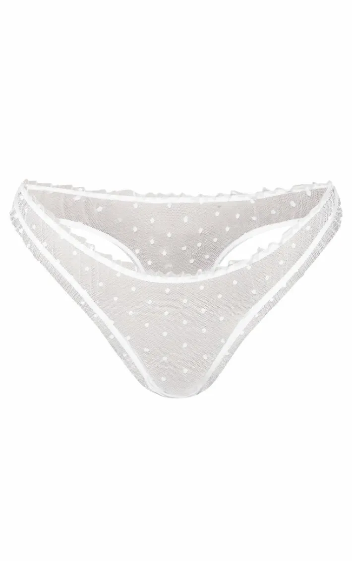 This white polka dot mesh frill thong is a must have in your collection. Brought to you in a white hue, with a polka dot design, mesh material and frill detail, what more could you want? Simply pair with the matching bralette for a look we’re loving.