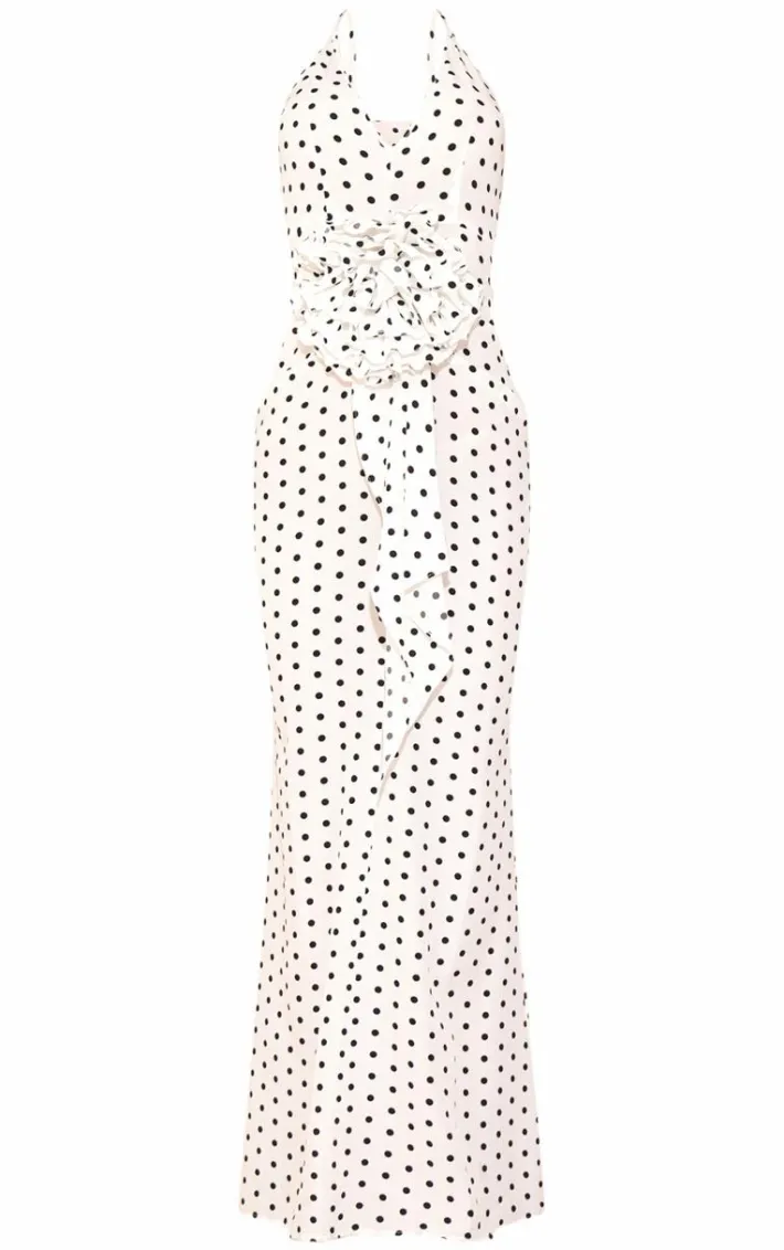 Go for all the effortlessly luxe vibes with this white polka dot satin rose detail maxi dress, you’re sure to have heads turning. This dress features a white satin material with a polka dot print and a rose detail, how could you not be in love? Pair this satin maxi dress with strappy heels and your go to accessories for a dreamy finish.