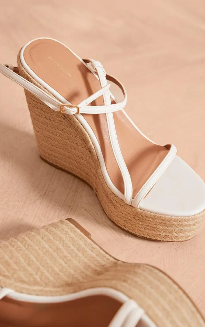 Take your look to the next level with these white PU round toe asymmetric strap espadrille high wedges. These wedges are brought to you in a white PU material with a round toe, an asymmetric strap and an espadrille wedged heel. how could you say no? Style these with your outfit of the day for a glam finish.