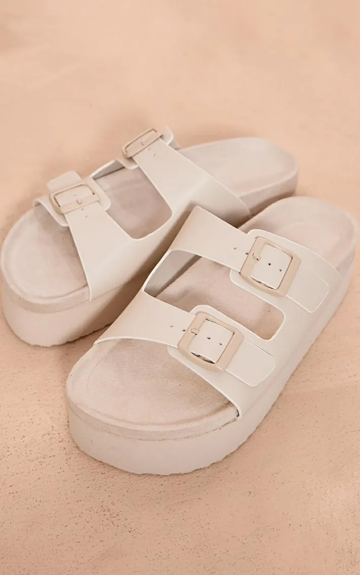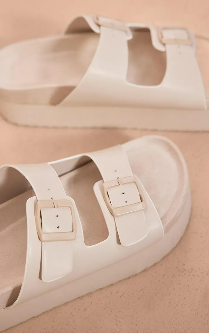 These white PU round toe double buckle strap chunky flat sandals are at the top of our new season hit list. Brought to you in a white PU material with a round toe design, double buckle straps and chunky soles, how can you go wrong? Style these white flat sandals seamlessly with your outfit of the day for a flawless finishing touch