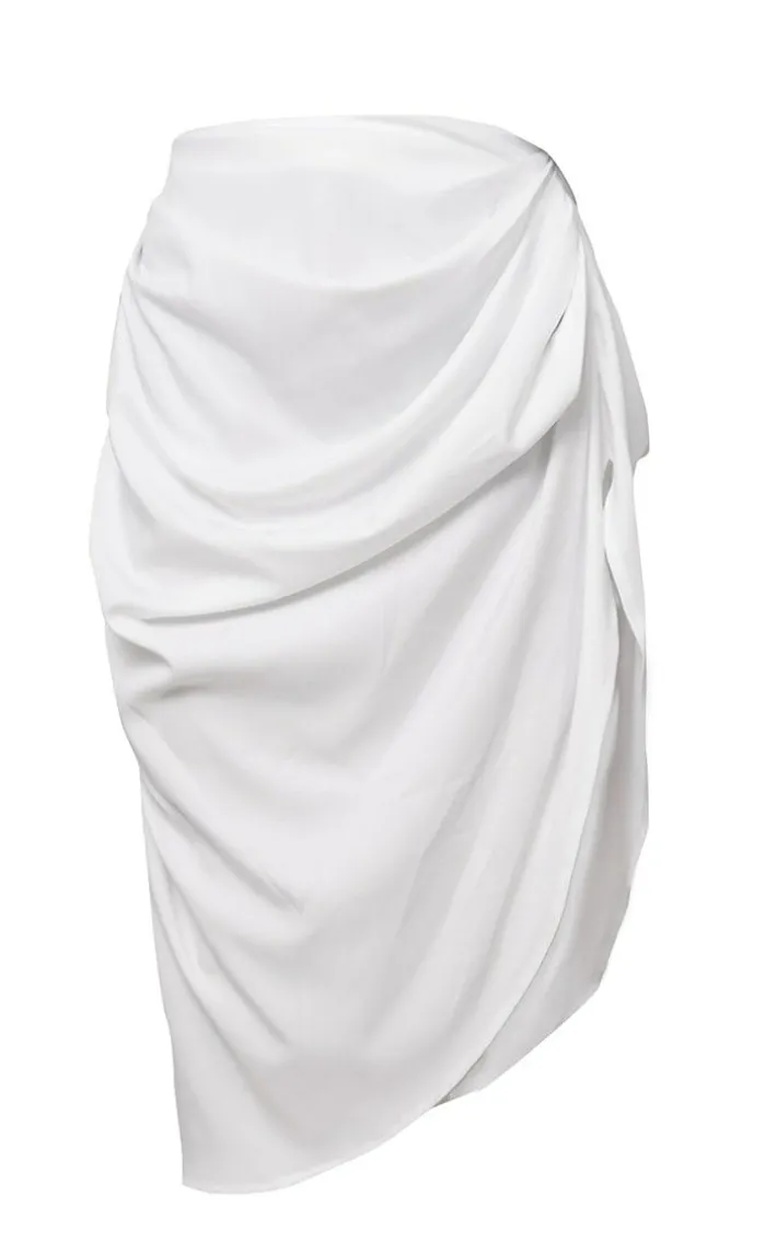 Give your weekend wardrobe a chic update with this skirt. Featuring a white material with a ruched side and a thigh-high split, we are in love. Just add a crop top and heeled mules for brunch.