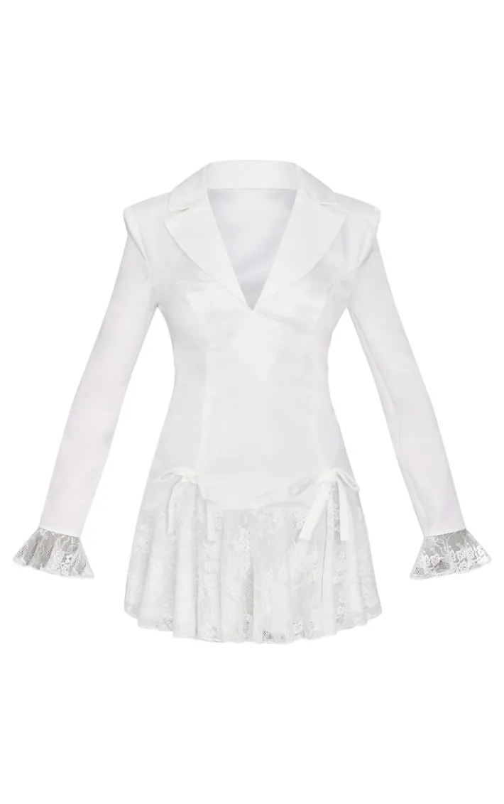 This white satin lace trim bow blazer dress is all the new you need in your collection. Brought to you in a crisp white shade, with a luxe satin material and lace trim design, what’s not to love? Team with a pair of heels and simple accessories for a look like no other.