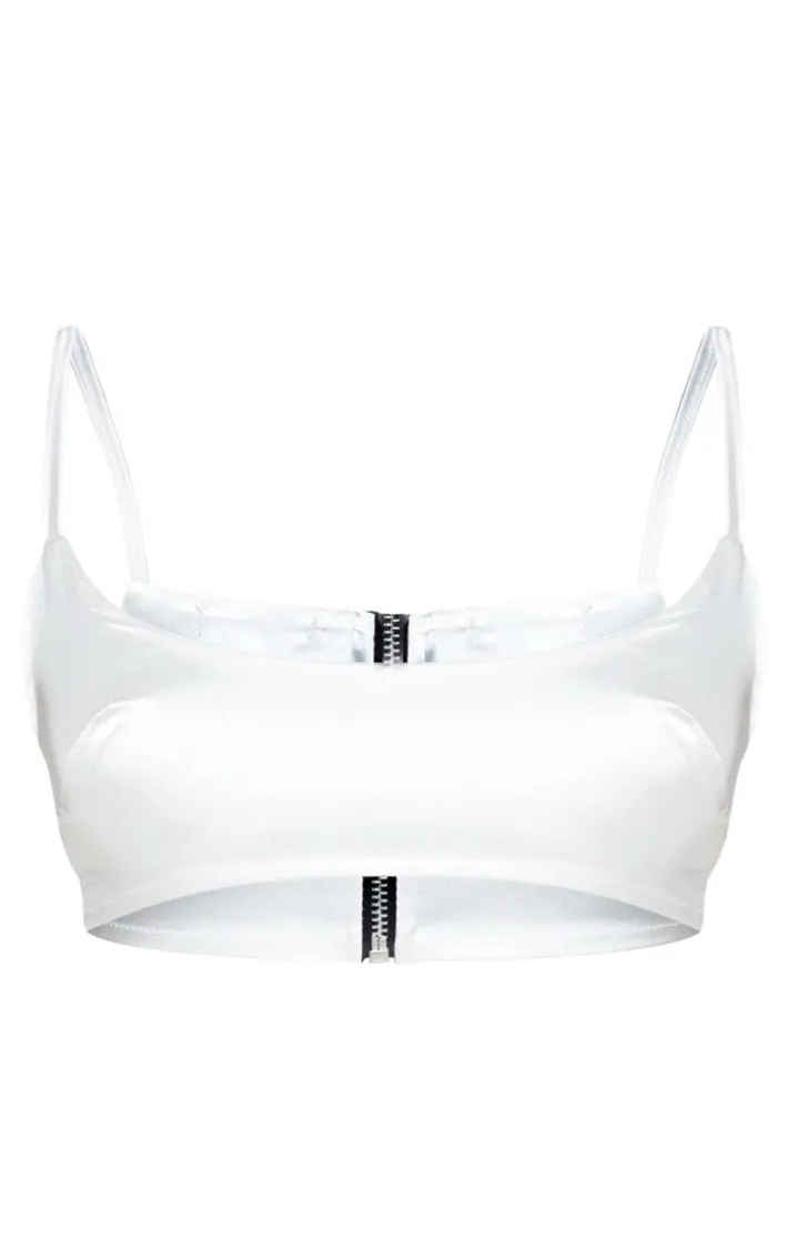 Double up on satin this weekend with this crop top and the matching skirt. Featuring a white satin material with a scoop neckline and a zip fastening, team this crop with the matching skirt and complete the look with high heels and a statement choker.