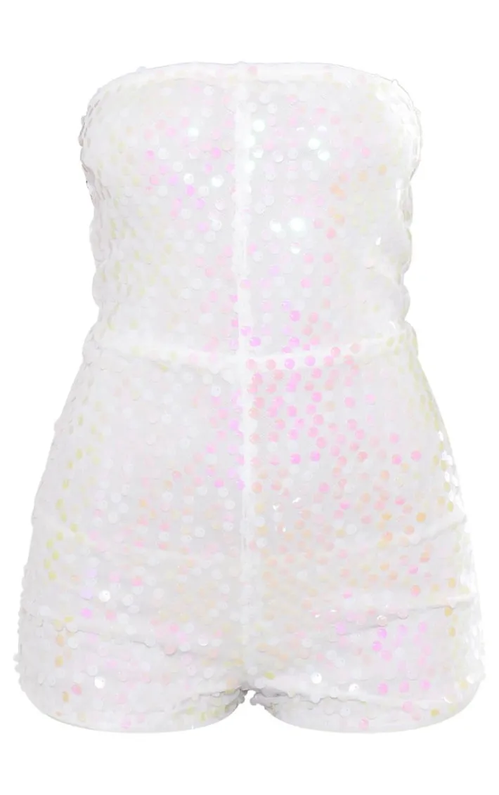 Make them stop and stare in this white sequin bandeau romper. Brought to you in a white hue material with a bandeau neckline and sequin detailing, how can you not be obsessed? In a figure-worshipping fit, this white romper is sure to take your style game from 0-100. Just add heels and statement accessories to elevate the look.